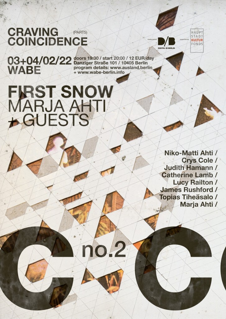I’m looking forward to performing as part of a wonderful 2-night program curated by Swedish-Finish artist Marja Ahti for the 5th edition of the Ausland (Berlin) series Craving Coincidence. It’s a beautiful program featuring; Marja Ahti, Nico Matti-Ahti & Topias Tiheäsalo, James Rushford & Judith Hamann on the first night – Thursday, February 3, and Catherine Lamb & Lucy Railton and myself on the Friday, February 4. In order to allow for more space in these times the event will take place at WABE.